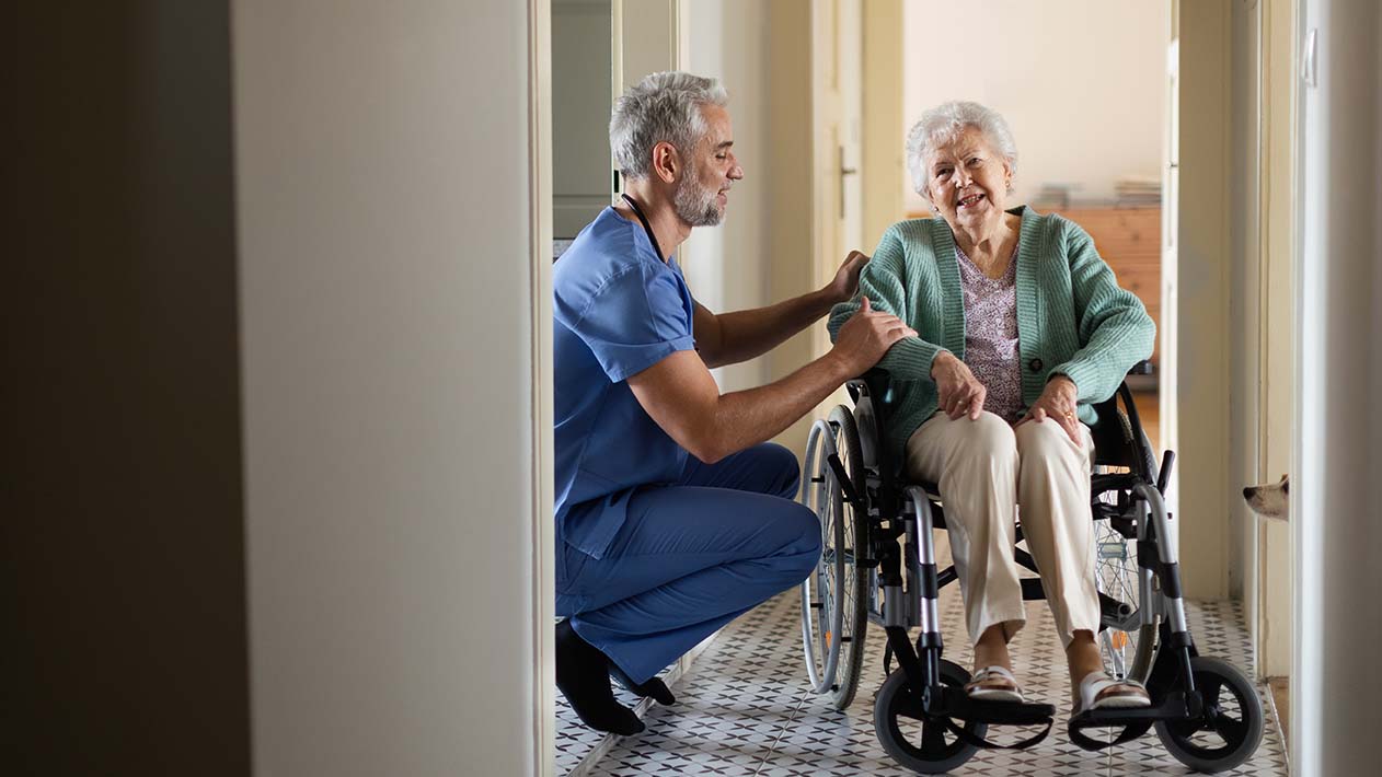 Ein Pfleger kniet neben einer Frau im Rollstuhl in deren Wohnung.