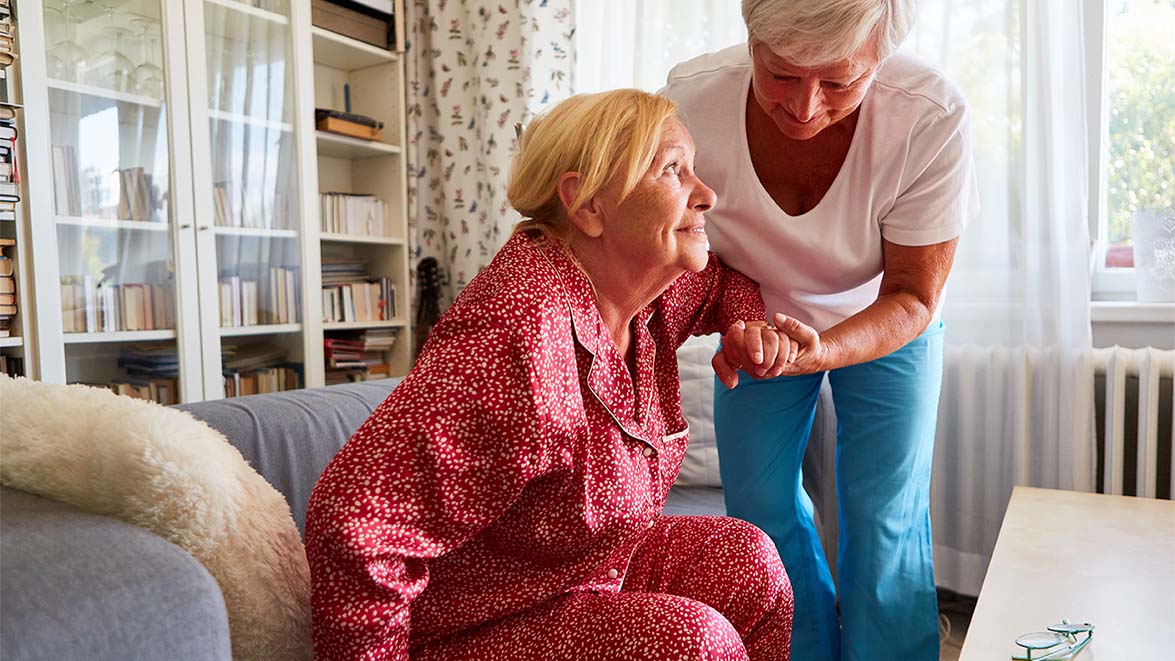 Eine Pflegekraft hilft einer älteren Frau beim Aufstehen vom Sofa.