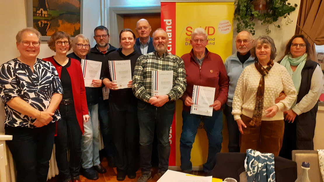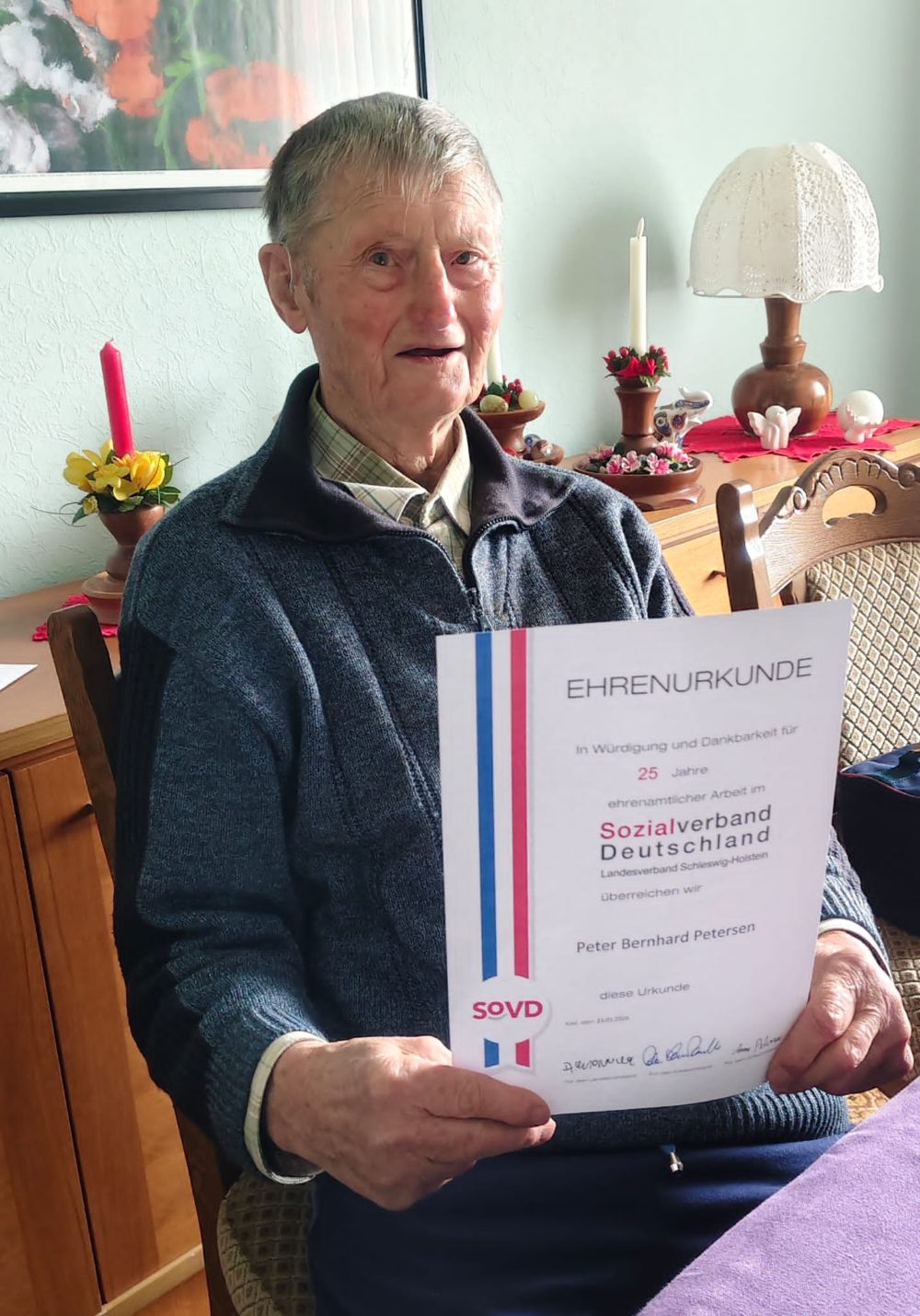 Peter Bernhard Petersen (92 Jahre) trägt seit über 25 Jahren, treu Monat für Monat, die SoVD-Zeitung bei den Mitgliedern im Ortsteil Rosenkranz aus. Als Dank für diese ehrenamtliche Tätigkeit besuchte ihn die Ortsvorsitzende Anne Petersen zu Hause und überreichte die entsprechende Urkunde, die er stolz auf dem Foto präsentiert, mit Ehrenschild und Präsent.