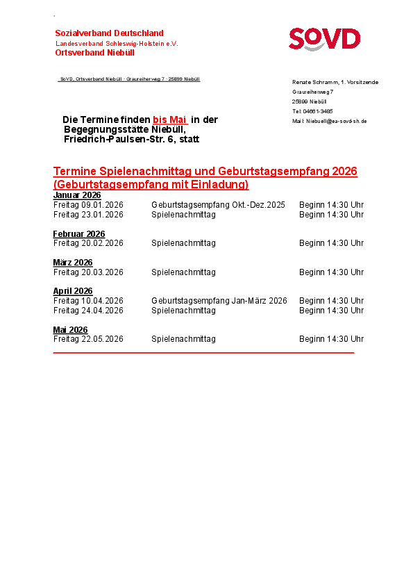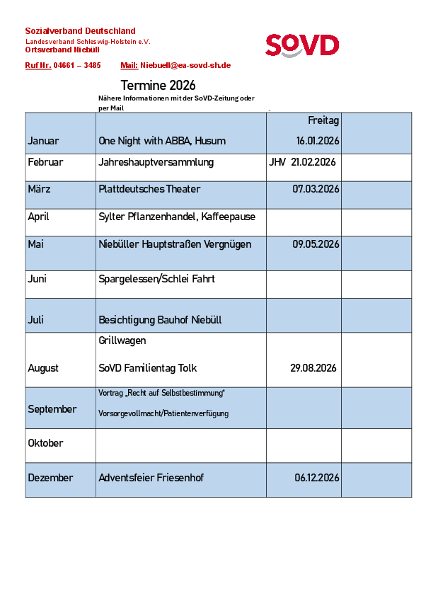 Als Anlauf- und Kontaktstelle für Mitglieder und für Interessierte bieten wir in ehrenamtlicher Regie regelmäßige Zusammenkünfte, Informationsveranstaltungen mit sozialpolitischem Inhalt, allgemeine Vorträge, gemütliche Runden und Feiern, Tages- und Mehrtagesfahrten und noch einiges mehr an. Das Motto unseres Ortsverbandes in Niebüll lautet „gemeinsam statt einsam“.