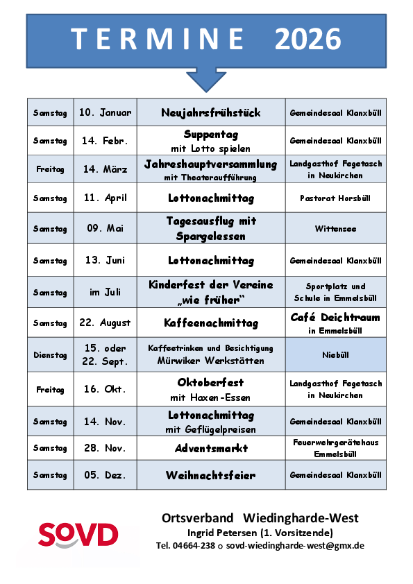 Als Anlauf- und Kontaktstelle für Mitglieder und für Interessierte bieten wir in ehrenamtlicher Regie regelmäßige Zusammenkünfte, Informationsveranstaltungen mit sozialpolitischem Inhalt, allgemeine Vorträge, gemütliche Runden und Feiern, Tages- und Mehrtagesfahrten und noch einiges mehr an. Das Motto unseres Ortsverbandes in Wiedingharde-West lautet „gemeinsam statt einsam“.